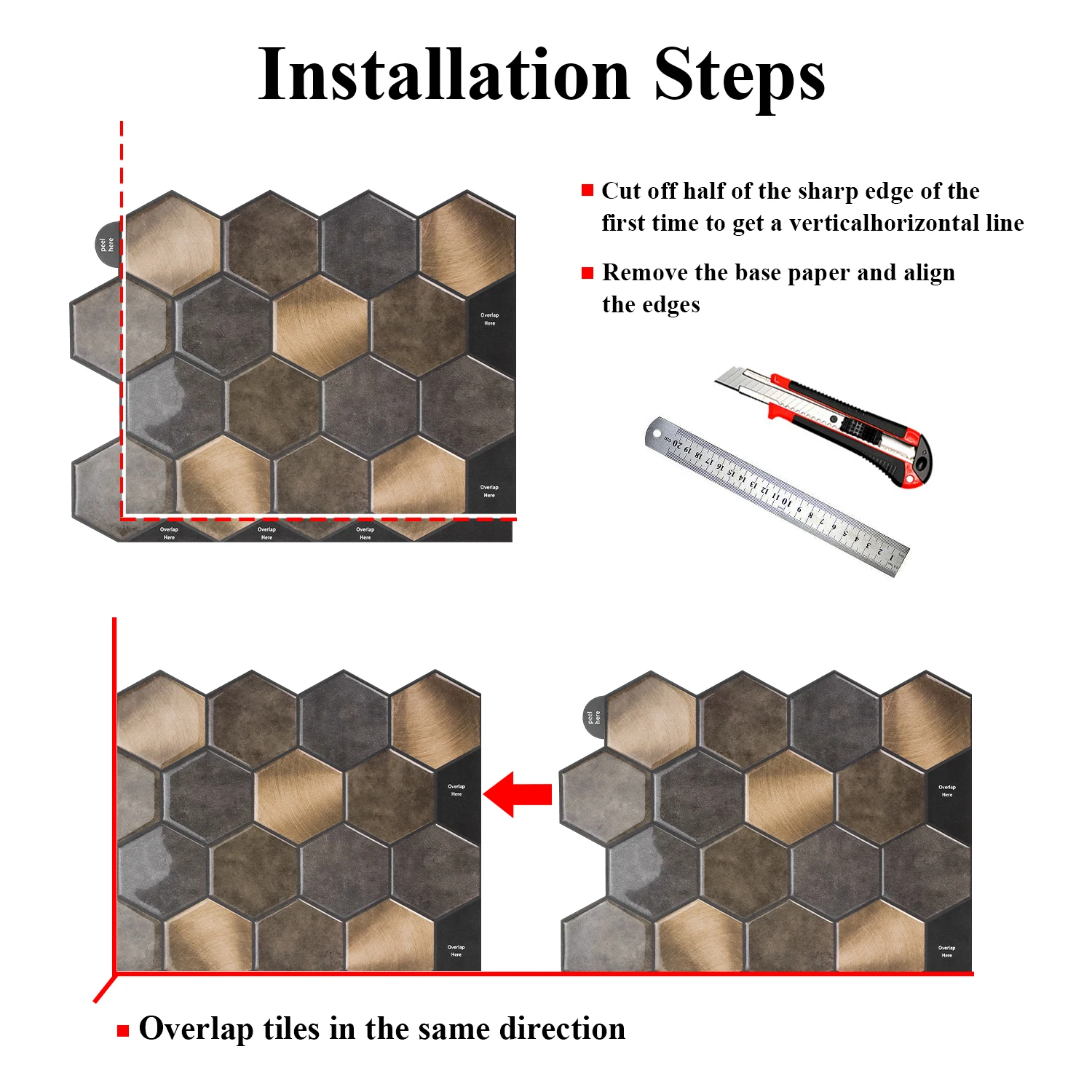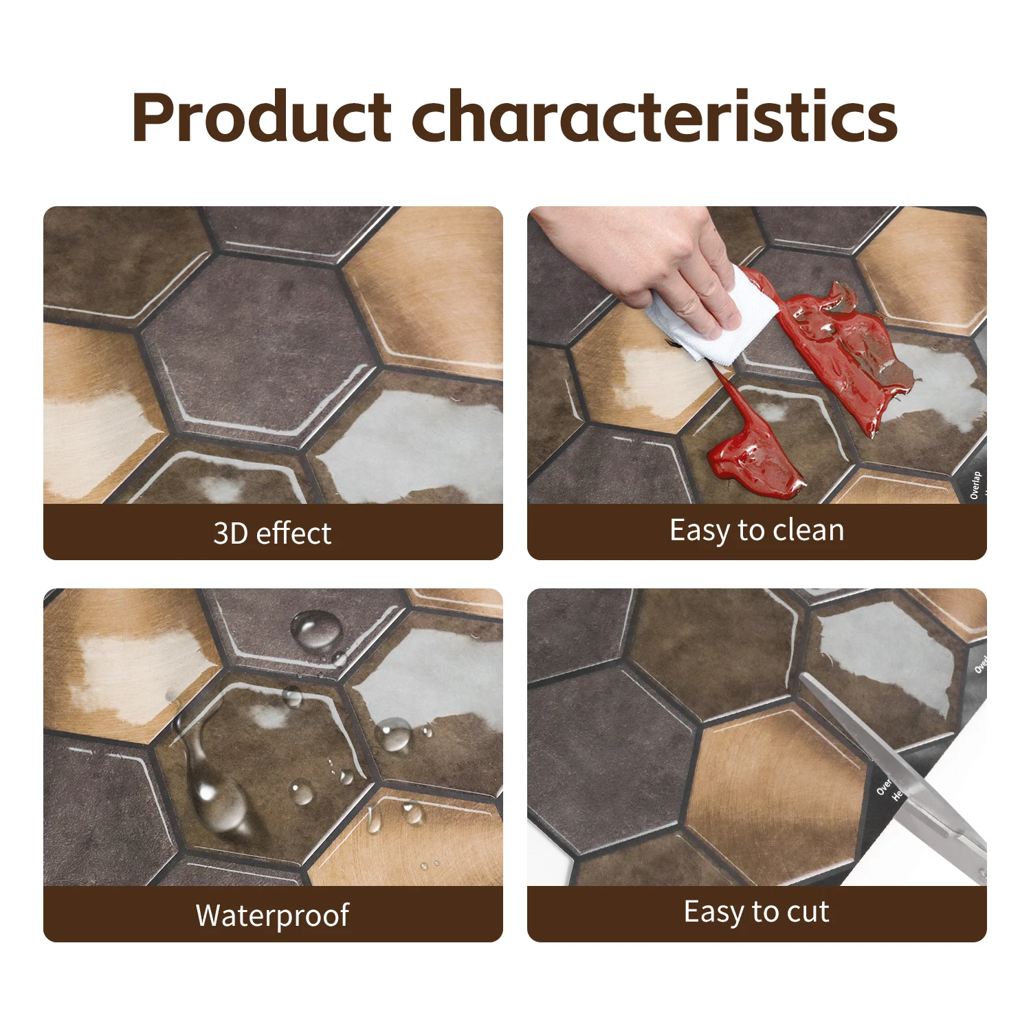 Die selbstklebenden 3D-Wandfliesen bieten eine stilvolle und schnelle Möglichkeit zur Verschönerung von Wohnräumen. Die realistische Optik sorgt für ein modernes Ambiente und eignet sich ideal für Küche, Bad oder Wohnzimmer. Dank wasserabweisender Oberfläche sind die Fliesen besonders pflegeleicht und langlebig. Die Montage erfolgt einfach durch Abziehen und Aufkleben auf glatten, sauberen Oberflächen. Nicht geeignet für raue oder feuchte Untergründe. Pflegehinweis: Mit einem feuchten Tuch reinigen, keine aggressiven Reinigungsmittel verwenden.