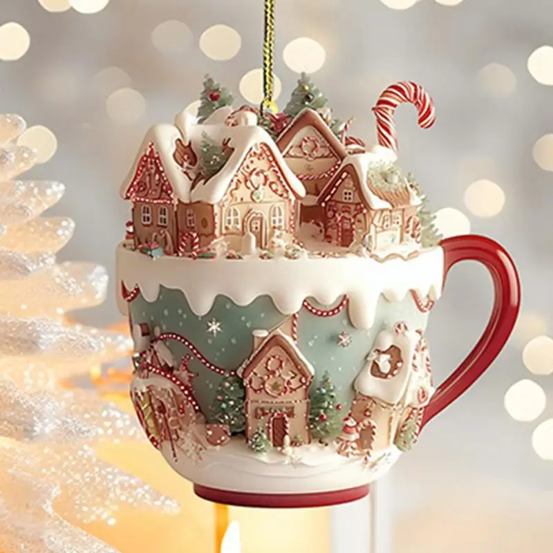 Dekorativer 2D‑Acrylanhänger in Form einer Kaffeetasse mit Schneelandschaft – ideal als Schlüsselanhänger, Baumornament oder Geschenkidee. Bringt Gemütlichkeit und Wintercharme in Ihre Deko.