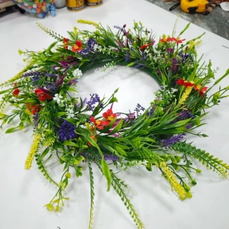 Dieser dekorative Wildblumenkranz mit Seidenblumen bringt die frische Atmosphäre von Frühling und Sommer direkt in Ihr Zuhause. Die harmonisch arrangierten Blumen und Blätter sorgen für eine natürliche und lebendige Optik.