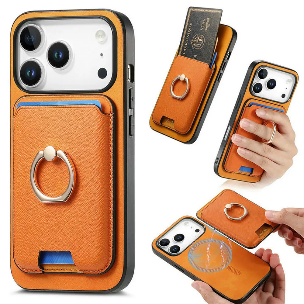 Dieses 2‑in‑1 System bietet eine abnehmbare Hülle mit integriertem Magnetring sowie eine Leder‑Brieftaschenkomponente mit Kartenfächern. Der magnetische Anschluss erlaubt kabelloses Laden. Die Konstruktion schützt zuverlässig und bietet Flexibilität in der Nutzung. Exakte Aussparungen sichern Zugriff auf Kamera, Anschlüsse und Tasten. Für Nutzer, die Vielseitigkeit und Stil kombinieren möchten.