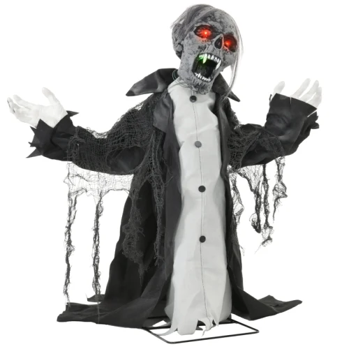 Diese animierte Halloween‑Dekoration bringt Schrecken in Ihr Zuhause oder den Garten: Ein detailreicher Totenkopf/Zombie mit beweglichen Armen, rot leuchtenden Augen und grünem Mundlicht reagiert auf Geräusche oder Bewegungen. Sobald jemand in die Nähe kommt, beginnt die Figur sich zu bewegen, dreht den Kopf und erzeugt unheimliche Geräusche – ideal für den Gruseleffekt an der Tür oder im Partyraum. Maße: 102 × 32 × 75 cm (L×B×H), Betrieb mit 3 × AA‑Batterien (nicht enthalten). Das geringe Gewicht (0,8 kg) ermöglicht flexible Platzierung in Innenräumen oder geschützten Außenbereichen. Ein echtes Highlight für Ihre Halloween‑Party oder als Erschrecker im Eingangsbereich.