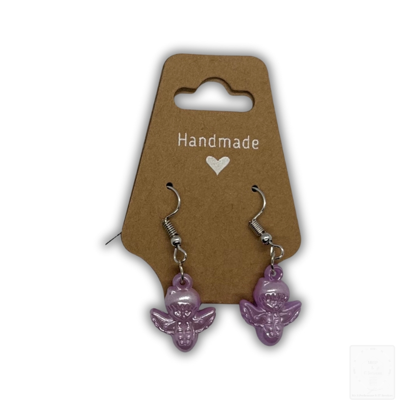Handgemachte Ohrringe in Flieder mit schimmernden Engelanhängern. Angenehm leicht zu tragen und vielseitig kombinierbar.