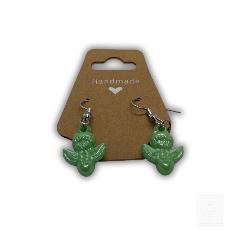 Farbige Ohrringe mit süßem Engel-Anhänger in grünem Glanz. Leicht und kreativ – ein schöner Akzent für festliche Anlässe.