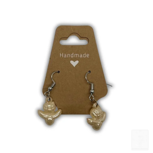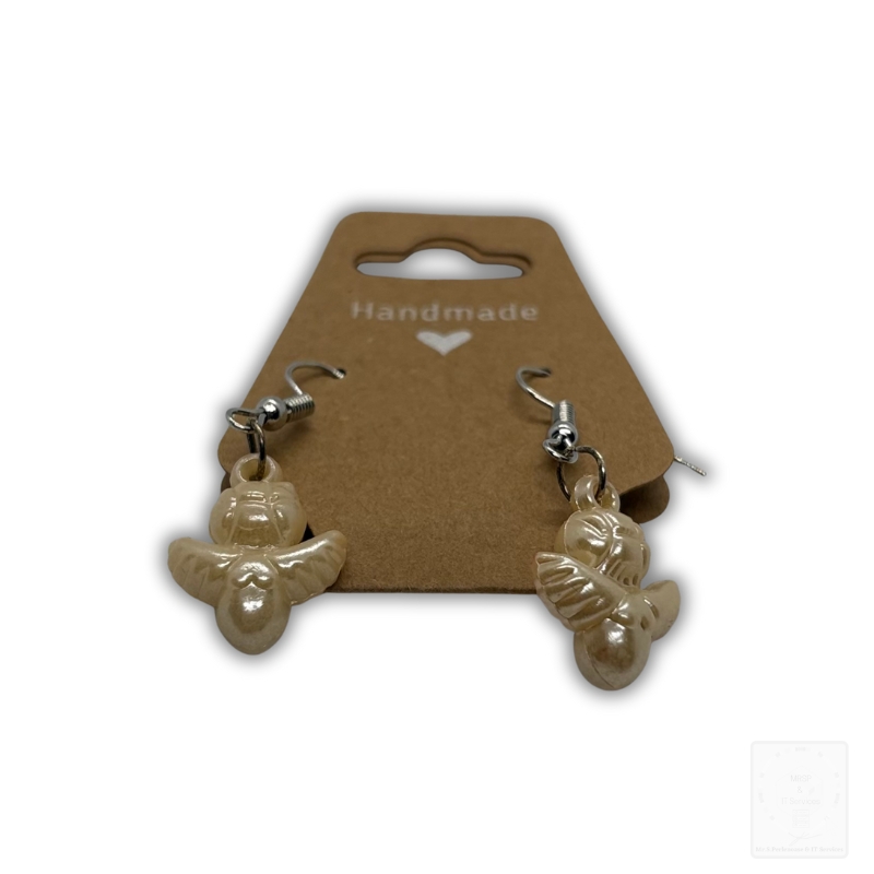 Zarte Ohrringe mit schimmernd weißen Engelmotiven. Handgemacht und ideal als kleines Mitbringsel oder Accessoire zu festlichen Outfits.