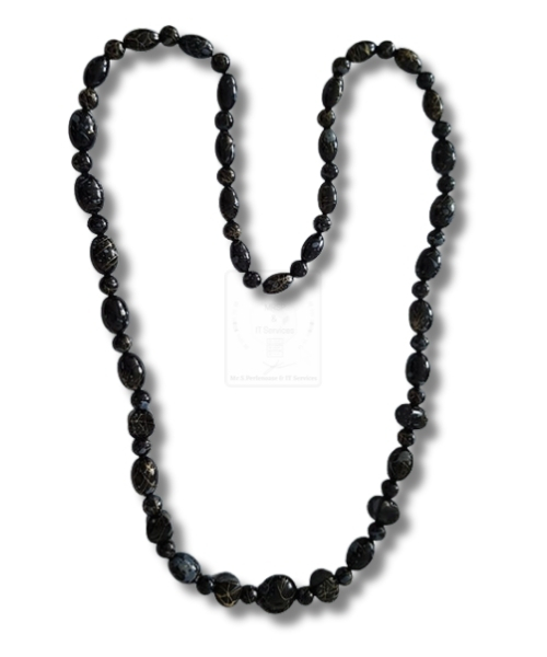 Lange schwarze Halskette mit gravierten Perlen – handgefertigt