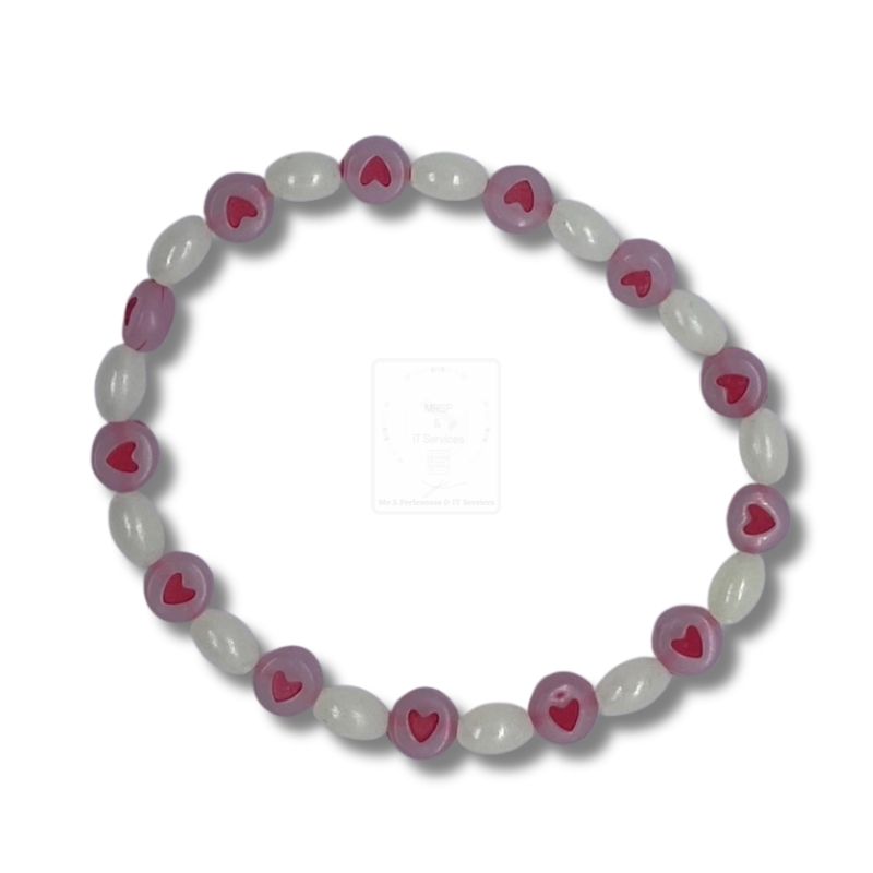 Weiß-Rosa Leuchtperlenarmband mit roten Herzen