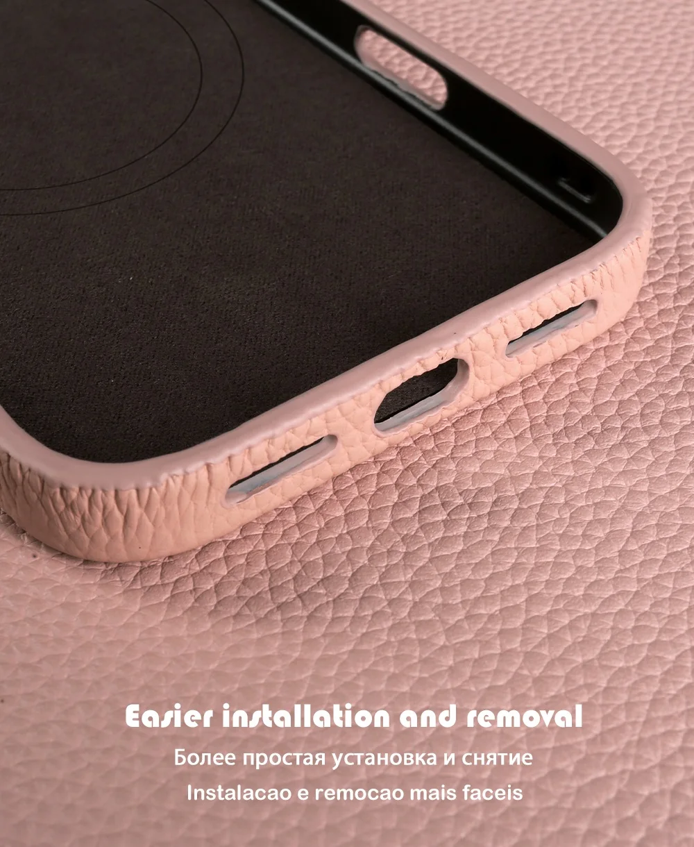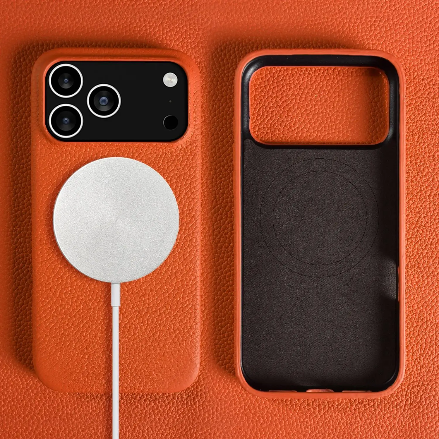 Diese Hülle besteht aus hochwertigem Echtleder auf der Rückseite kombiniert mit schlanker Bauweise. Der integrierte Magnetring ermöglicht kabelloses Laden und Zubehörbefestigung. Die Hülle schützt das iPhone ohne zu klobig zu sein. Aussparungen für Kamera, Tasten und Anschlüsse bleiben frei zugänglich. Für Nutzer, die dezenter Look und Funktionalität kombinieren möchten.
