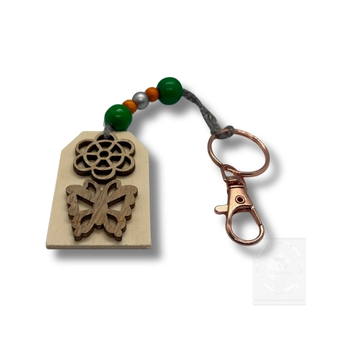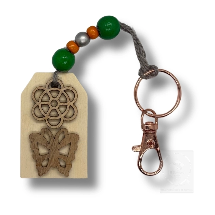 Nachhaltiger Frühlings-Schlüsselanhänger mit Ornament & Schmetterling aus Holz
