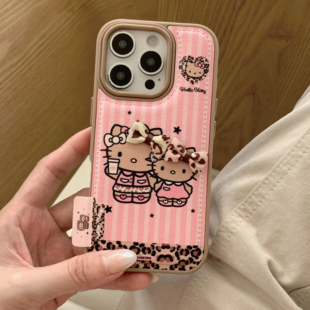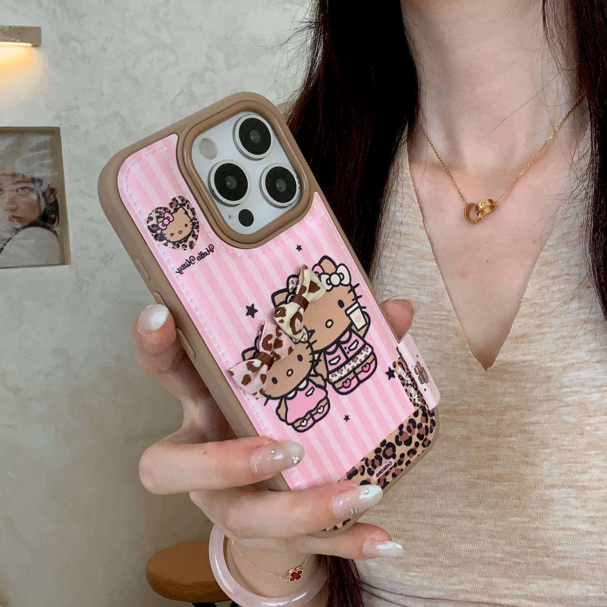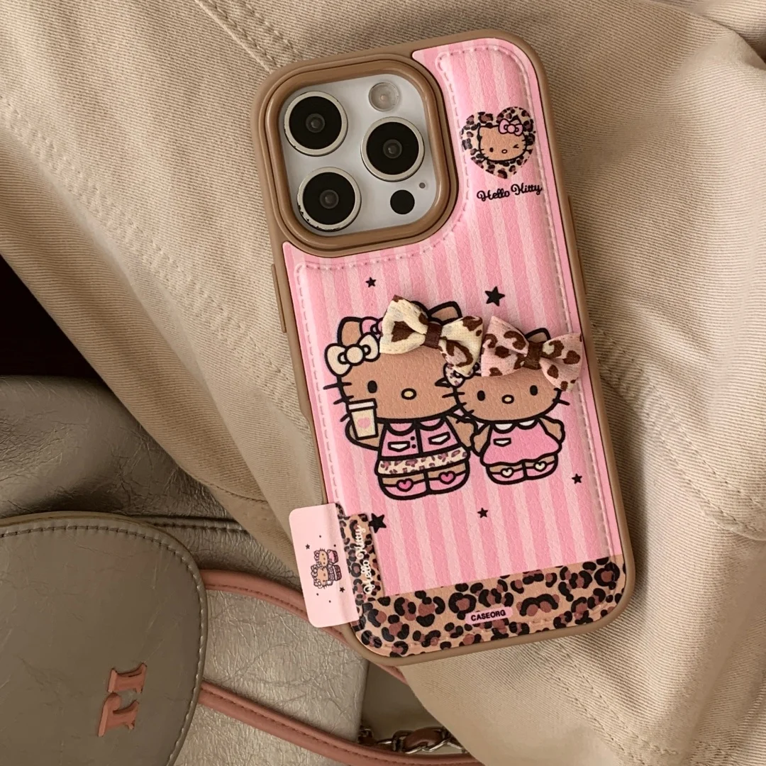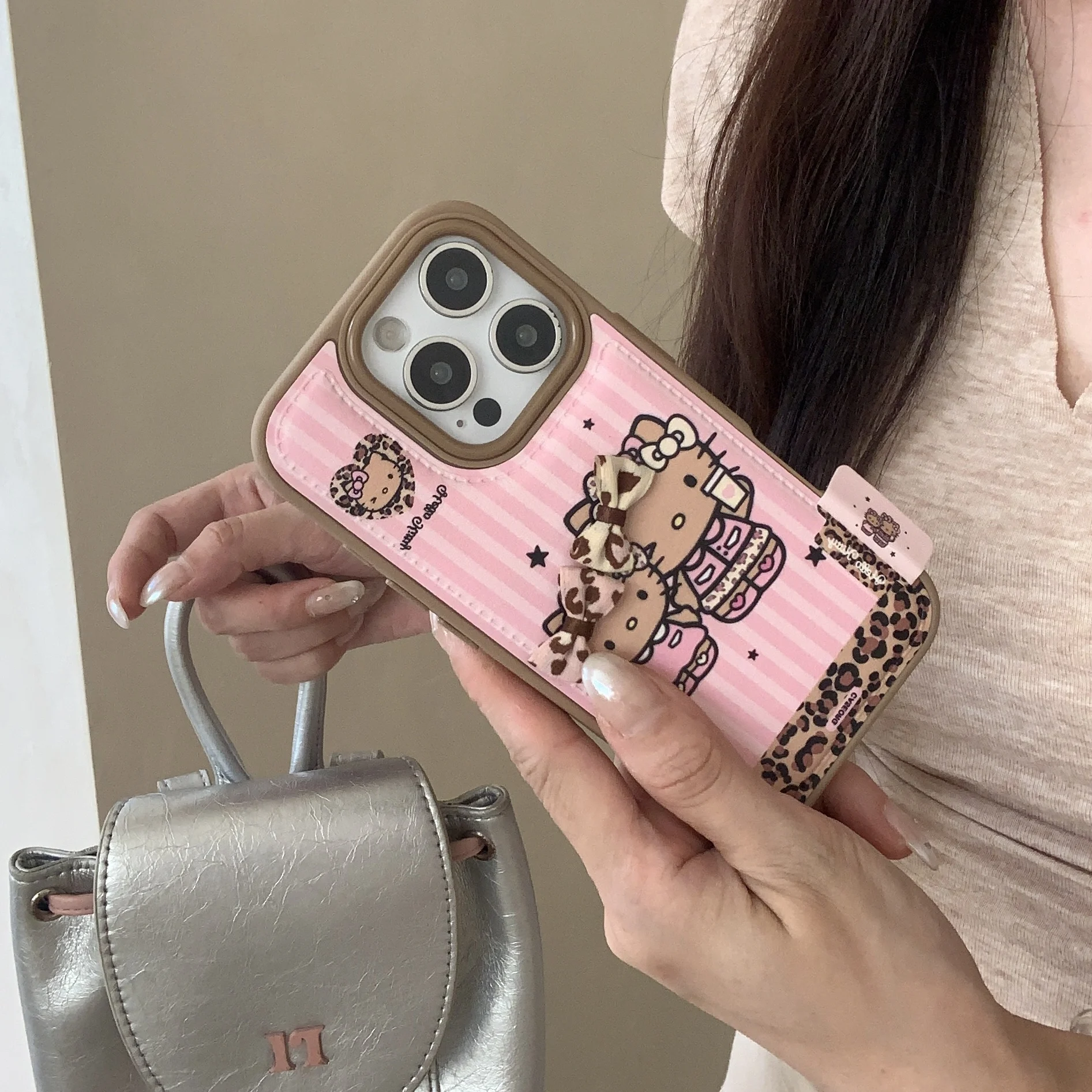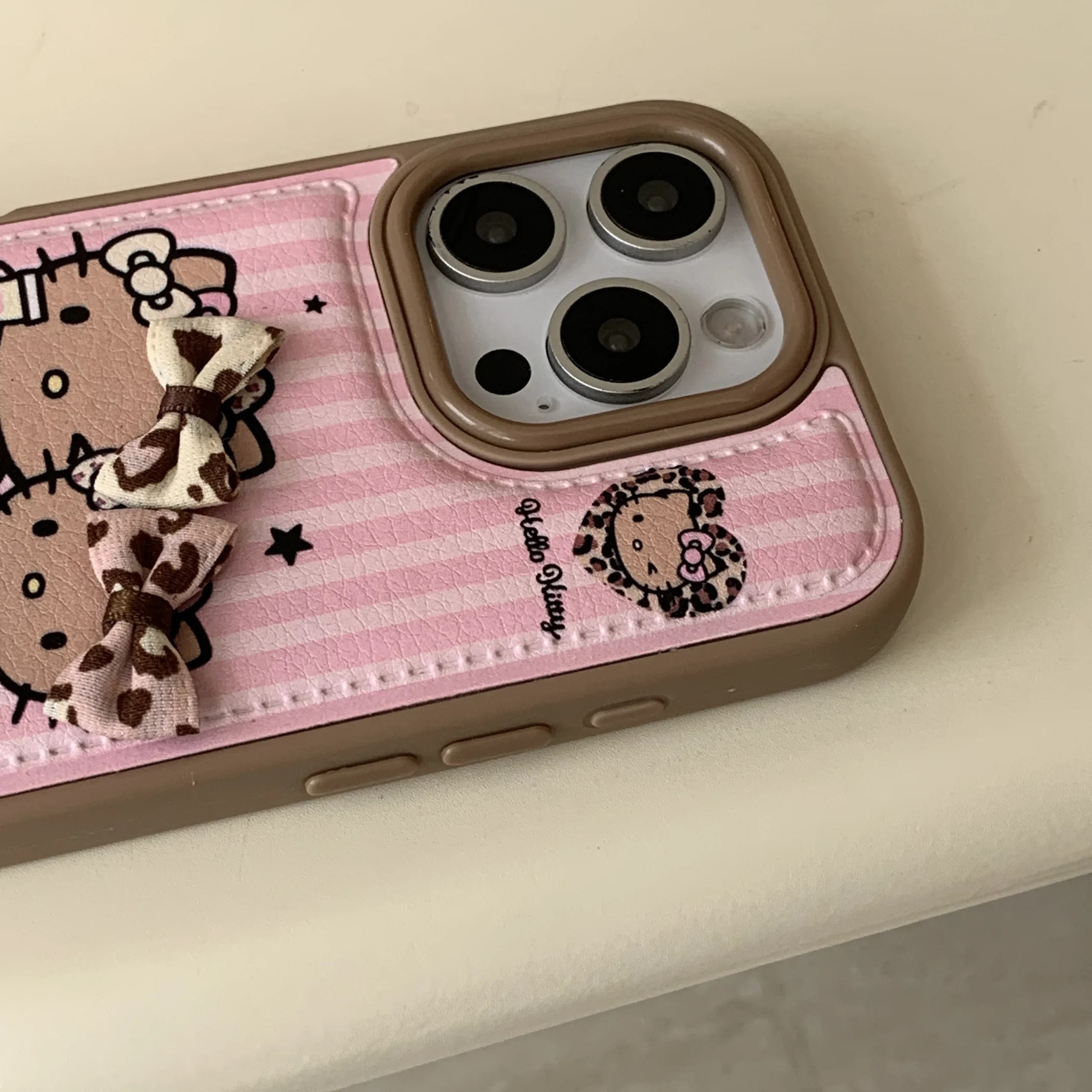 Leoparden‑Schleifen Hello‑Kitty Lederhülle (iPhone 14–17 Serie)