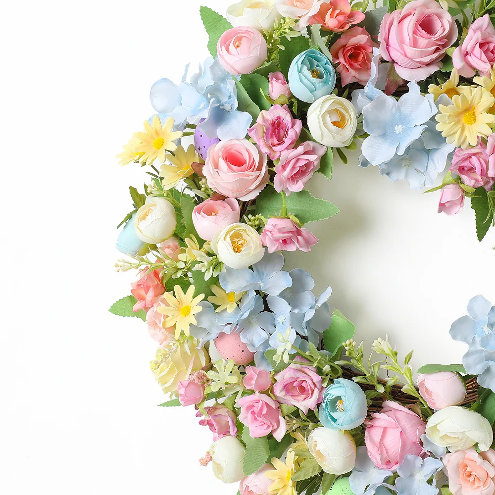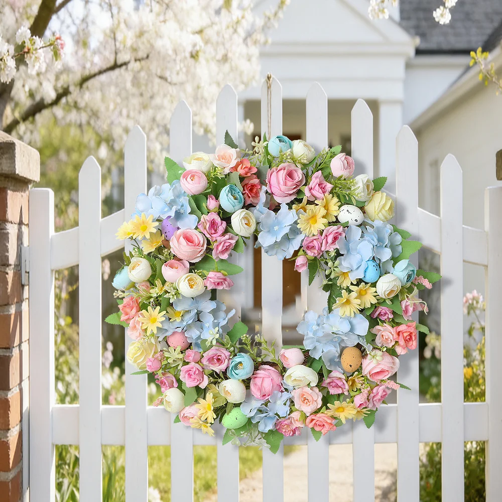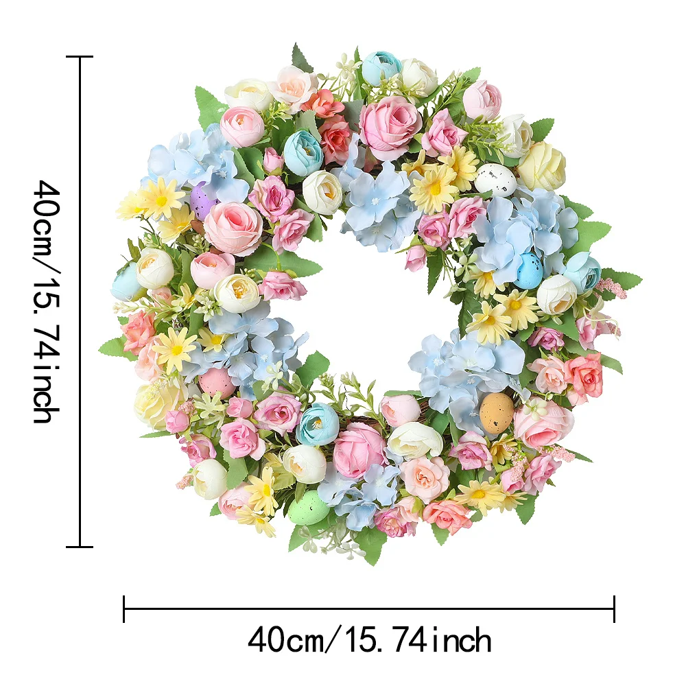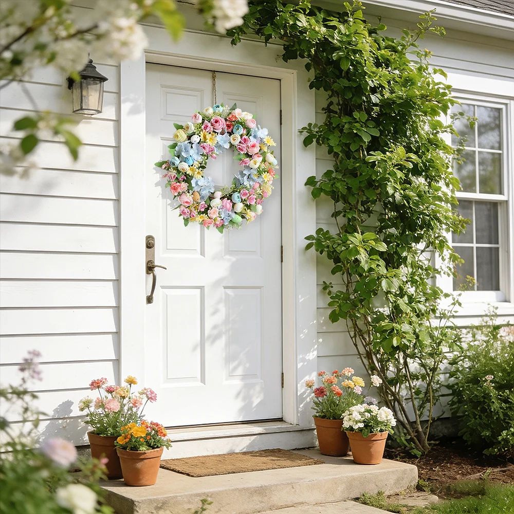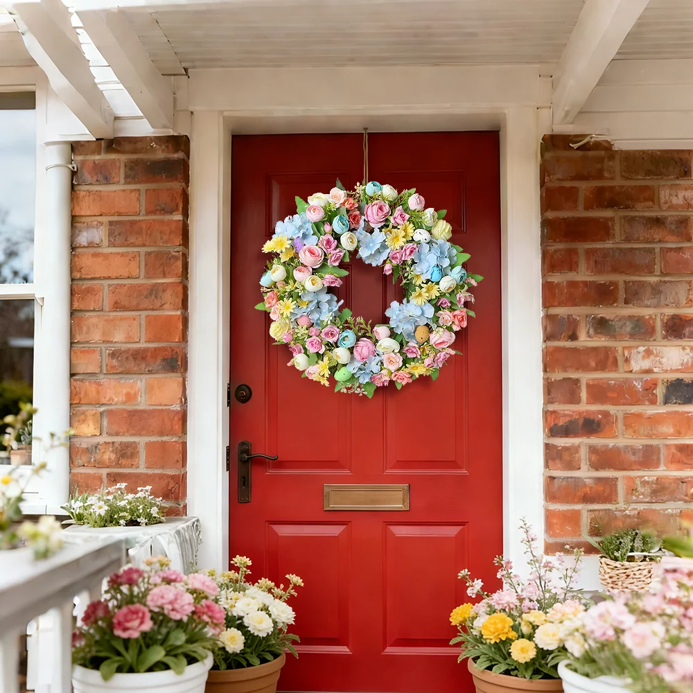 Der Blumenkranz eignet sich ideal für Osterfeiern, Frühlingsdekorationen oder als stilvolle Wanddekoration im Eingangsbereich. Durch das harmonische Blumendesign entsteht eine freundliche und einladende Atmosphäre.