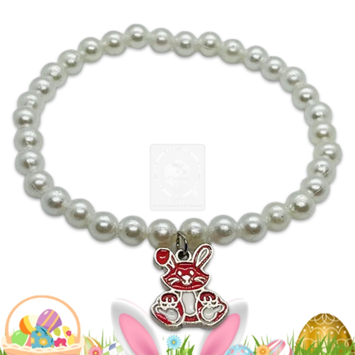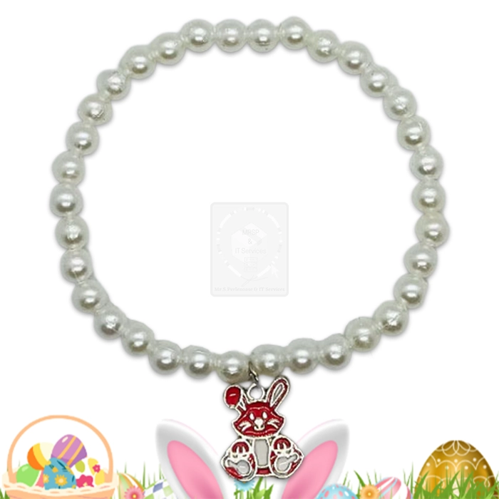 Osterarmband mit weißen Perlen und Hasenanhänger