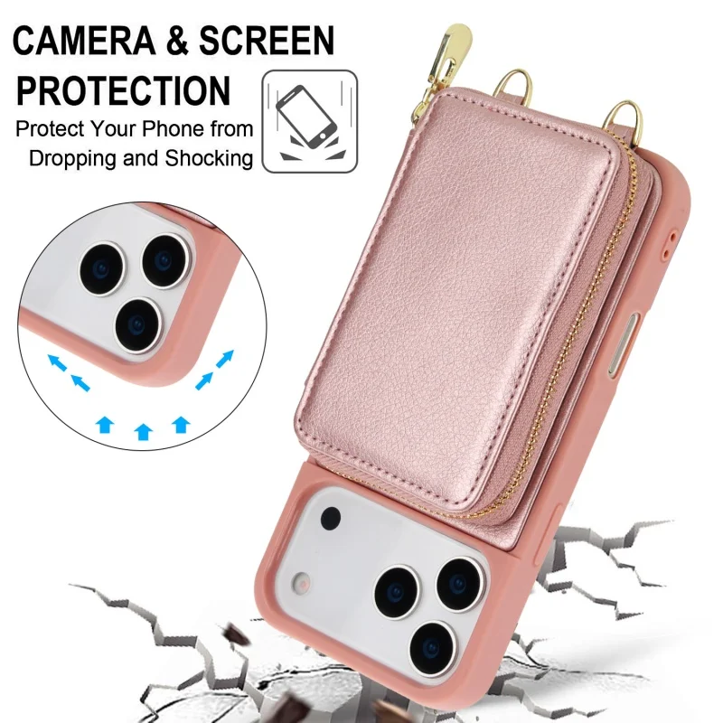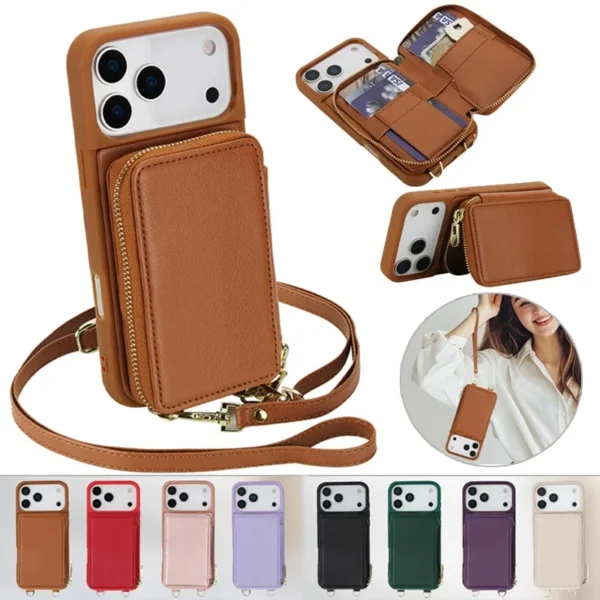 Reißverschluss Leder‑Wallet Hülle mit Karten & Lanyard (iPhone 11–17)
