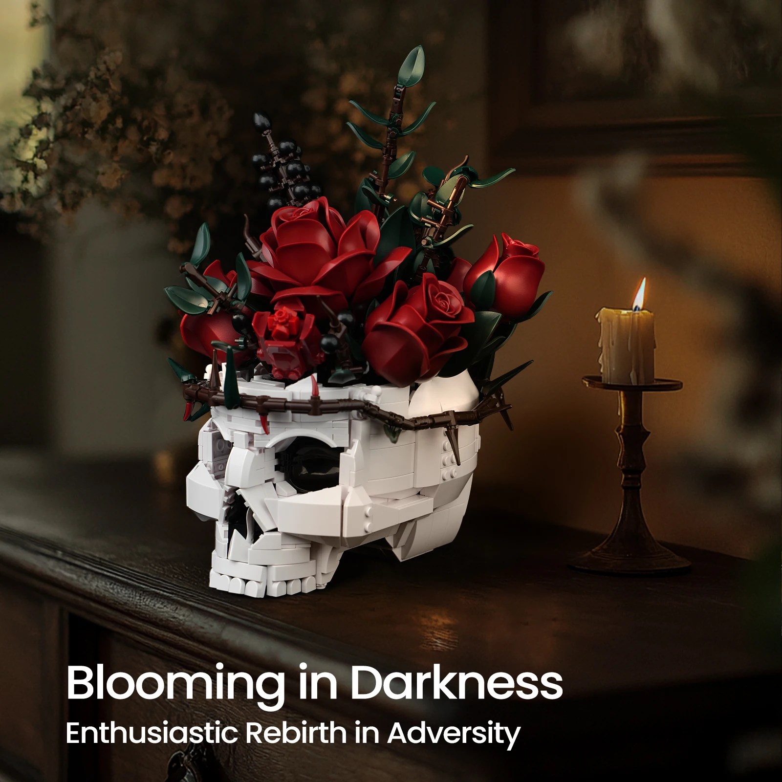 SupreOwls Halloween‑Baustein‑Set mit Totenkopf‑Blumen & Gothic‑Rosen