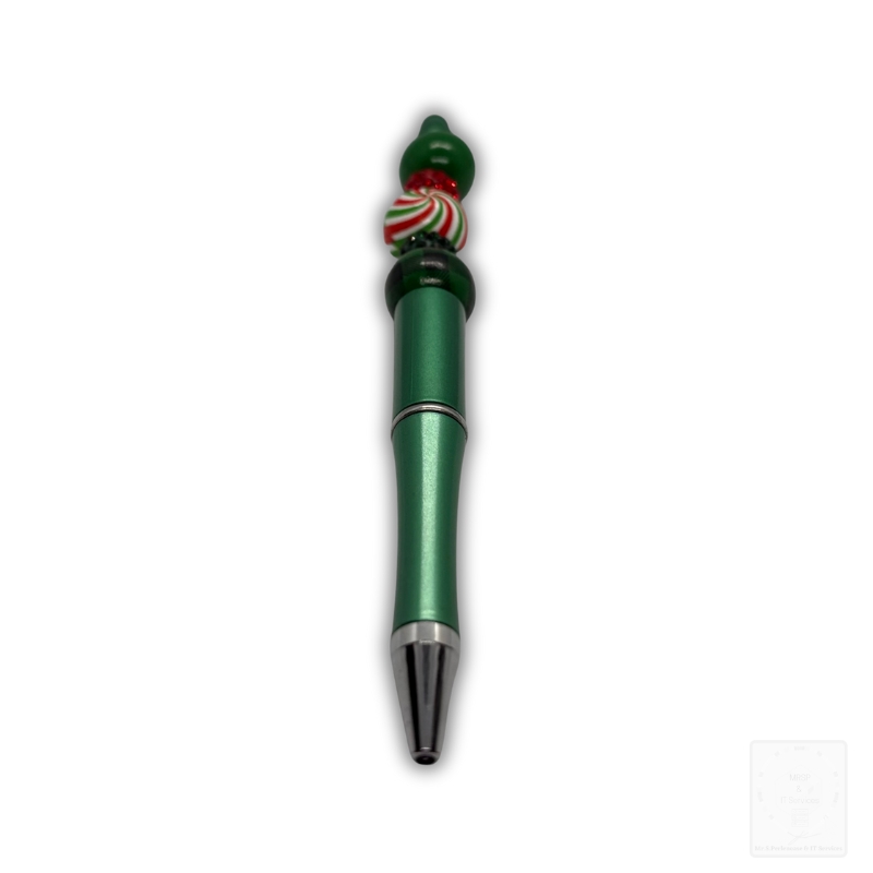 Stylischer Weihnachtskugelschreiber mit verspieltem Zuckerstangen-Perlendekor und grünem Gehäuse. Ein Hingucker auf jedem Schreibtisch.